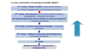 La formation initiale du DGCI s’étale sur quatre ans. Elle conduit à l’obtention d’un double diplôme : la Licence de Sciences de Gestion délivré par l’Université de Poitiers + une année préparatoire pour le Master de l’Université de Poitiers, ainsi que le Baccalauréos de Commerce, délivré par l’Université Aïn Shams. Les Universités partenaires sont l’Université Aïn Shams (Égypte), l’IAE de Poitiers et l’Université de Poitiers
